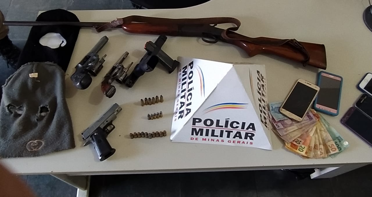 Três autores maiores presos;04 armas de fogo aprendidas, sendo um revólver .32, um revólver .38, uma pistola Taurus .40 e uma espingarda calibre .28; 01 réplica de pistola; materiais e dinheiro subtraídos da propriedade rural, reconhecidos pelas vítimas e 01 veículo recuperado.