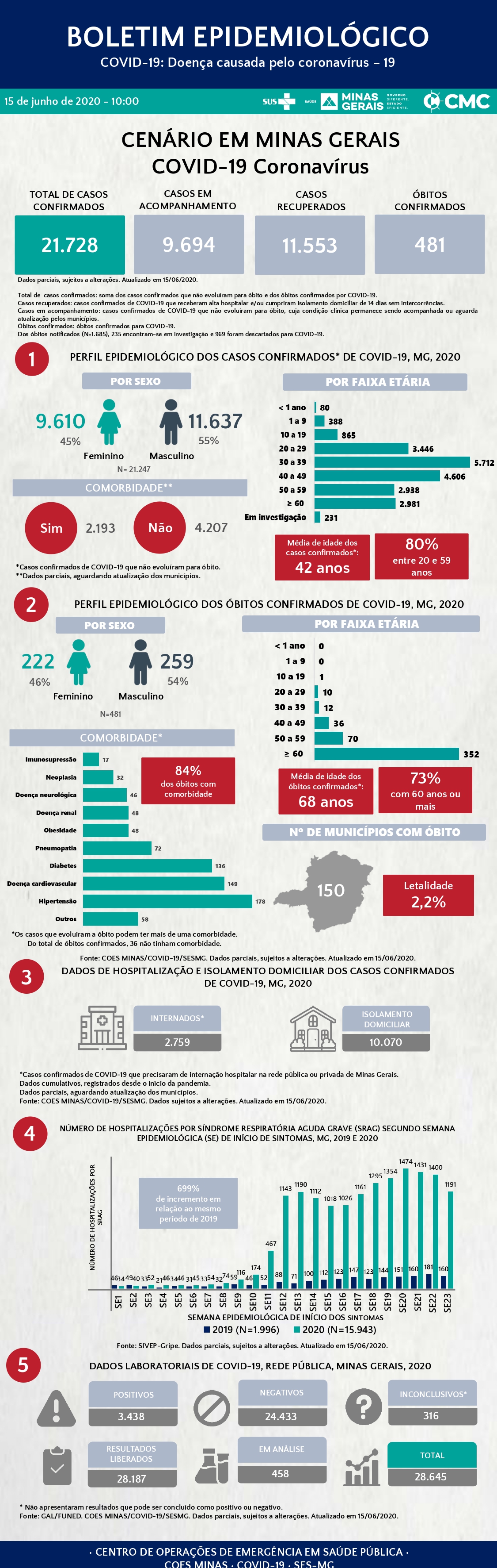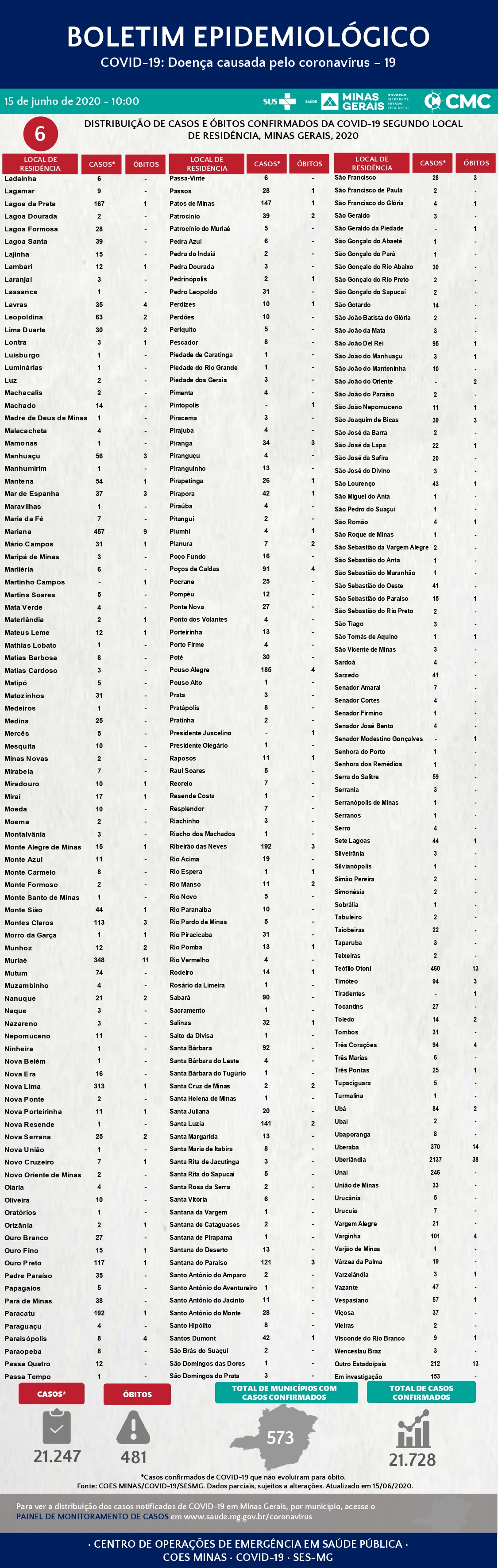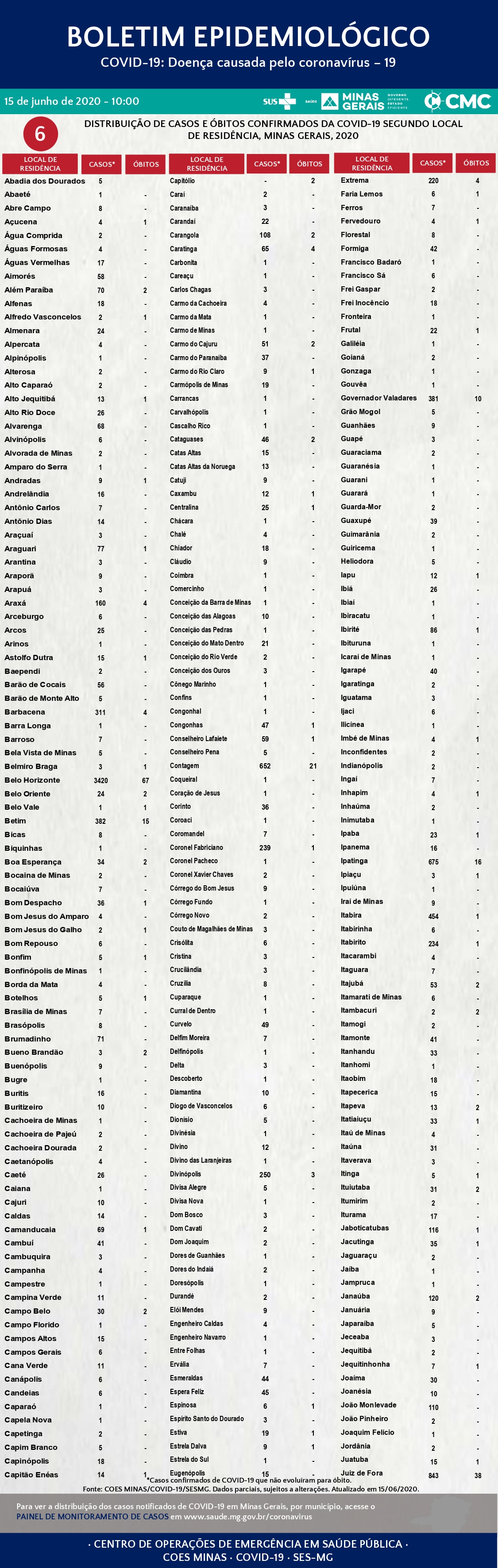 Dados parciais, sujeitos a alterações. Atualizado em 15/6/2020. Fonte: COES MINAS/COVID-19/SES-MG.