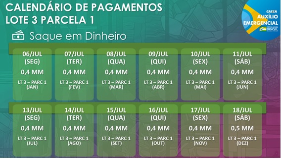 O processo envolverá dois calendários: um de crédito em conta e outro de saque. O primeiro procedimento será realizado semanalmente, às segundas-feiras, começando no dia 29 de junho e indo até 21 de setembro. A exceção será o dia 8 de setembro, terça-feira, em função do feriado da independência.