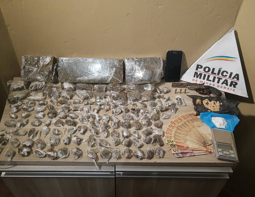 Os militares diante das suspeitas procederam buscas na residência do autor de 24 anos, onde encontraram 107 buchas de maconha; 18 tablete tamanho médio de maconha; 02 tabletes grandes de maconha; 01 barra grande (aproximadamente um quilograma) de maconha; 69 pedras análogas ao crack; 01 balança de precisão; Dinheiro; 01 arma de fogo tipo garrucha, dois canos, calibre.32; 04 (quatro) munições calibre .22; 01 invólucro plástico contendo um pó branco de cocaína; 01 lâmina de aço com resquícios de crack.