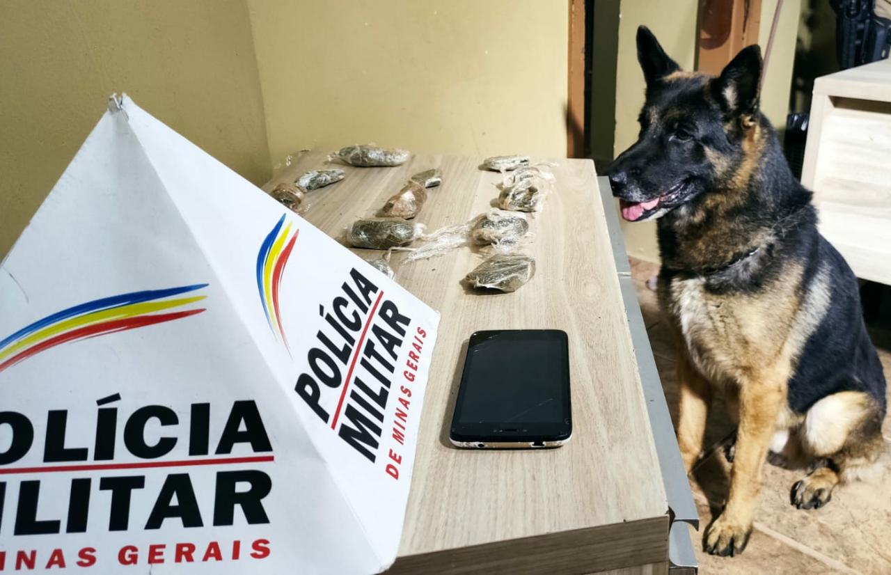 Para suplementar a ação policial, foi realizado o emprego do cão farejador Apollo, que apresentou comportamento positivo para drogas, indicando em três pontos distintos a localização de quatorze buchas de maconha embrulhadas em papel filme, sendo que um rolo de papel filme foi encontrado em um dos pontos.