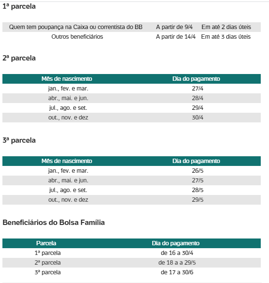 As duas parcelas seguintes do auxílio serão depositadas conforme o mês de nascimento do beneficiário (veja na tabela mais abaixo).