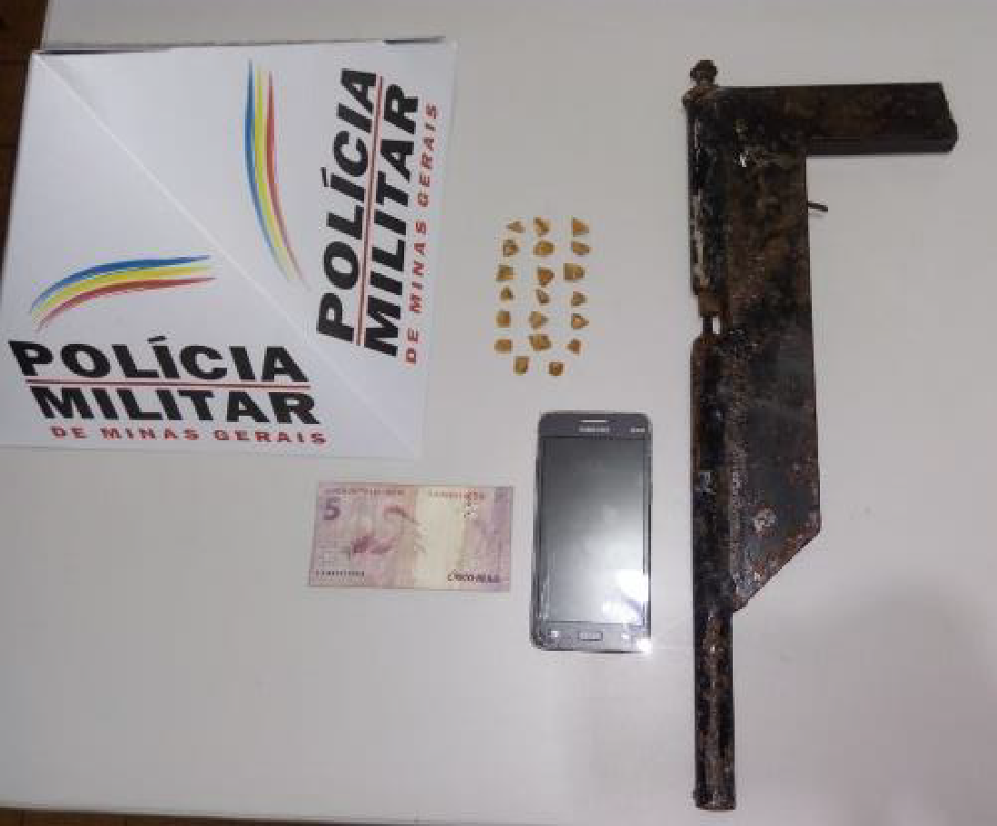 Durante as buscas, foi localizado no bolso de sua bermuda um invólucro plástico contendo 20 pedras de crack, prontas para venda, juntamente com uma cédula de 5,00 reais e um aparelho celular.