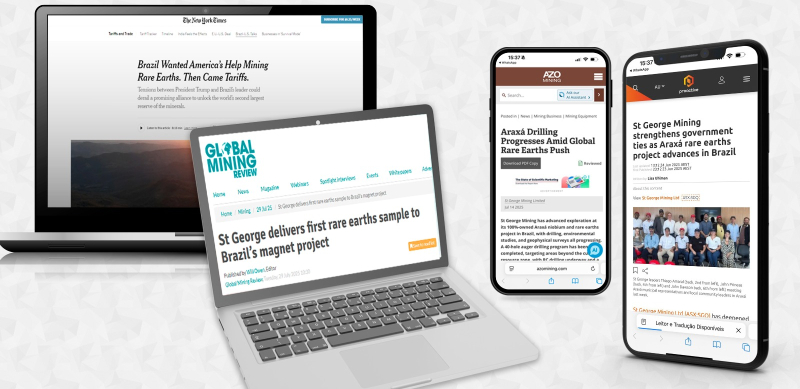 Já a Proactive Investors ressaltou a relevância do apoio público local e estadual, destacando que “a combinação do apoio dos governos local e estadual e de um recurso de classe mundial contribui para posicionar muito bem a St George para realizar nossa visão de uma mina de terras raras e nióbio globalmente significativa em Araxá.”