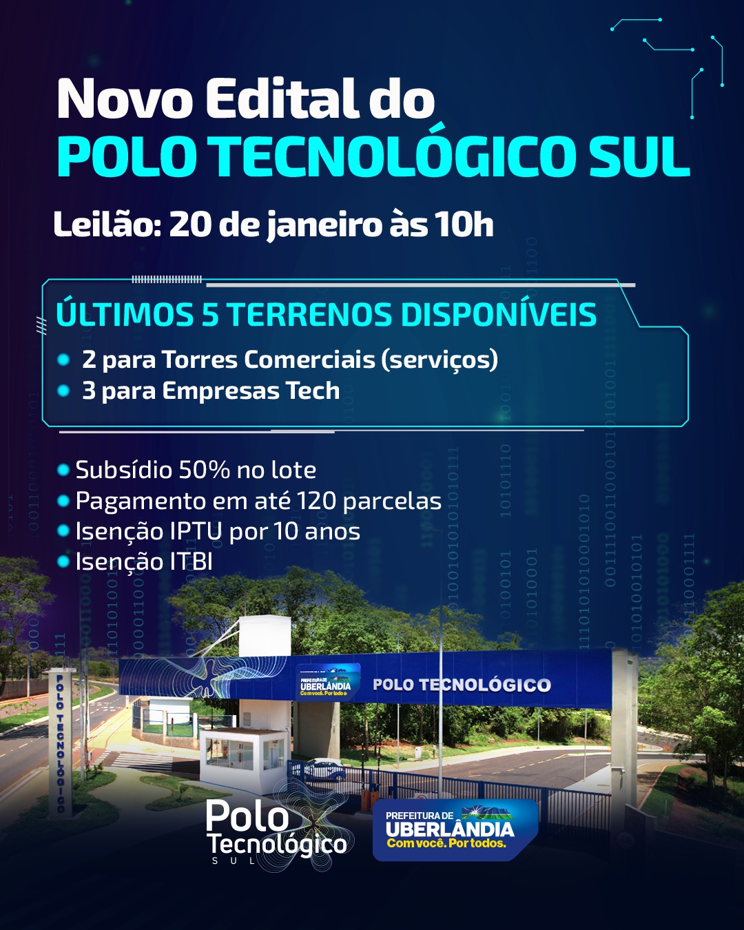 Com o objetivo de continuar impulsionando o desenvolvimento tecnológico e o ecossistema de inovação do município, a Prefeitura de Uberlândia abriu novo edital para venda dos últimos lotes do Polo Tecnológico Sul. O aviso de licitação pública, na modalidade leilão eletrônico, foi publicado no Diário Oficial do Município (DOM). No total, cinco imóveis estão disponíveis para lances, sendo três para empresas de base tecnológica e mais dois destinados para atividades de suporte, com subsídio de até 50% pelo Município, como serviço financeiro, infraestrutura, capacitação e gestão. O leilão eletrônico pode ser acessado pelo Portal Nacional de Contratações Públicas e pelo portal do leiloeiro público oficial até o dia 20 de janeiro.