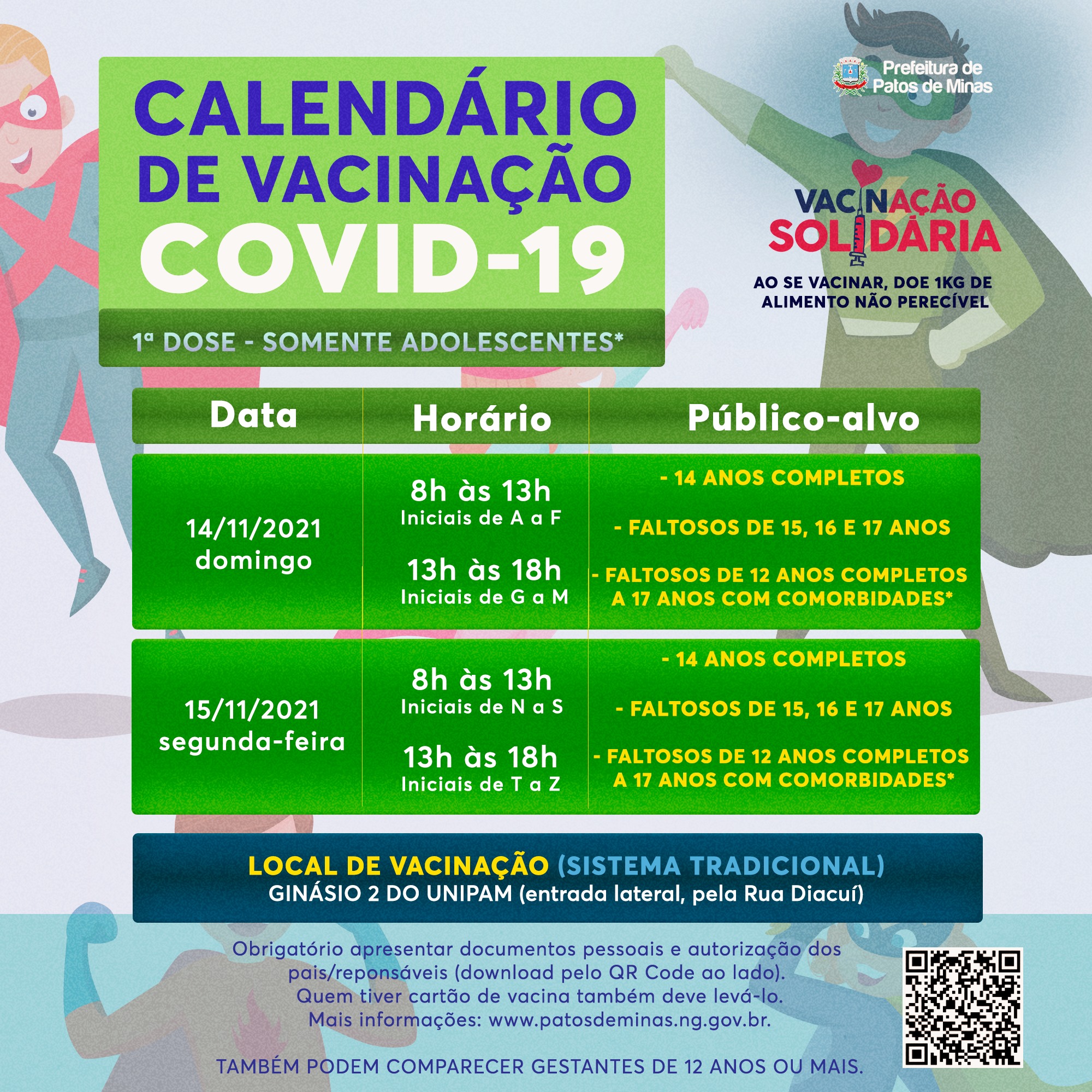 De acordo com os informes divulgados pela Prefeitura de Patos de Minas, a imunização para pessoas com 14 anos começa já neste domingo 14/11 para jovens com nomes de A até M. Na segunda 15/11, de N até Z, completando a vacinação para a faixa etária.