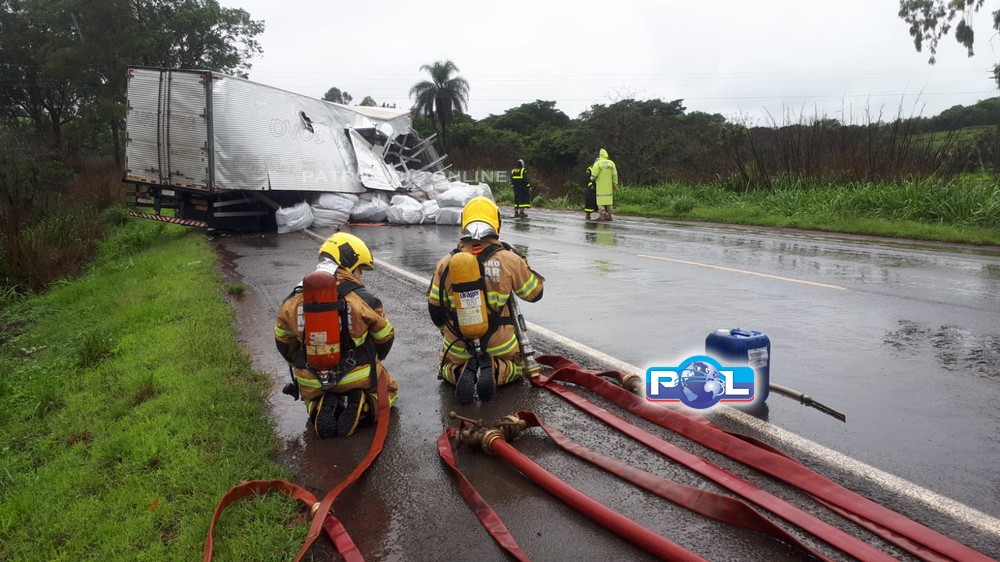 As equipes do Corpo de Bombeiro trabalham na prevenção até a chegada da empresa responsável por fazer o transbordo da carga.