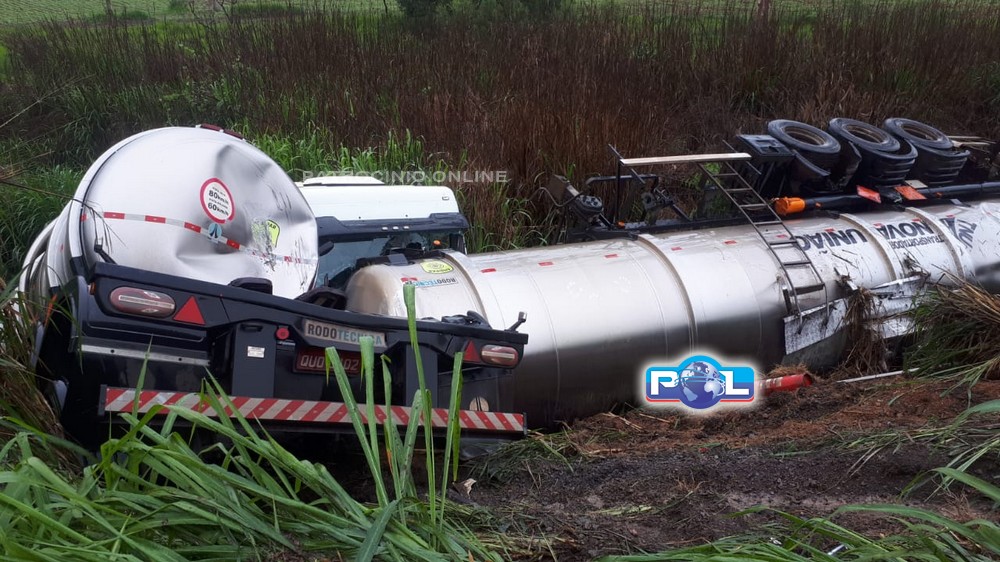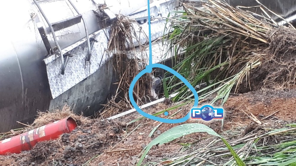 Um dos tanques da carreta bitrem (30.000 L) apresenta vazamento.