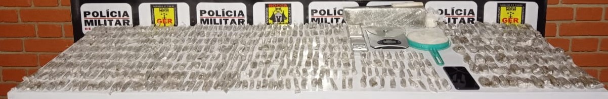 Durante as buscas, os militares localizaram 01 barra de maconha prensada e várias buchas de maconha, 01 balança de precisão. Todo o material ilícito arrecadado totalizou 520 buchas de maconha.