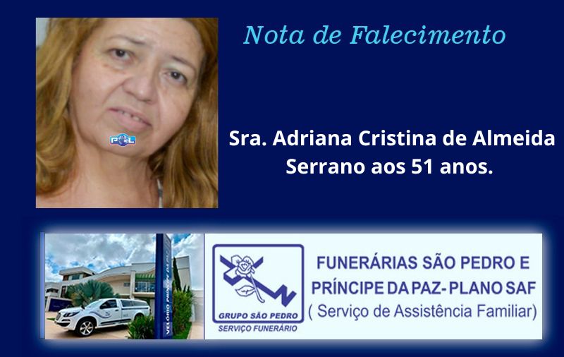 Faleceu nesta segunda-feira, 06 de abril de 2026, em Patrocínio/MG, a Sra. Adriana Cristina de Almeida Serrano aos 51 anos.