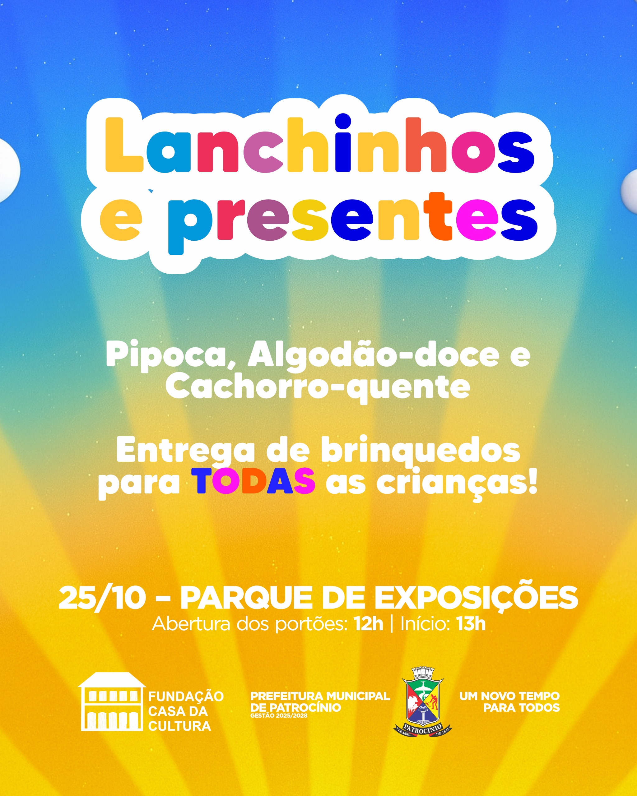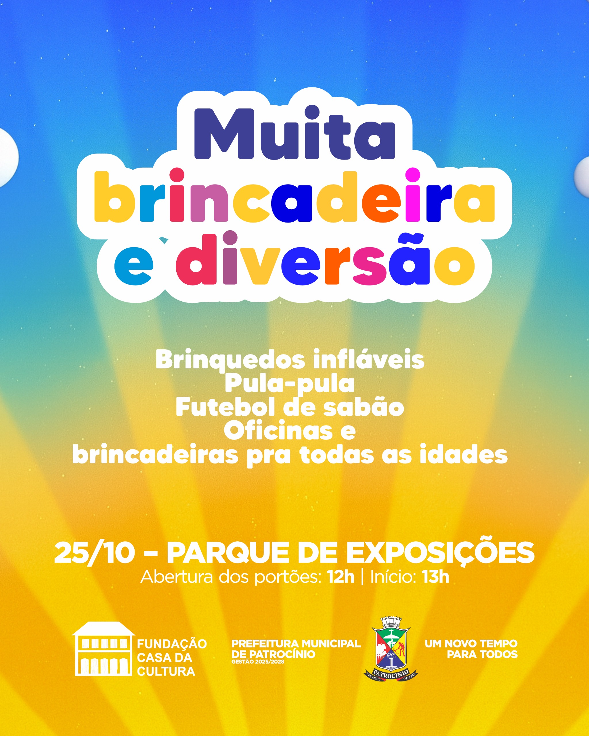 A Prefeitura Municipal de Patrocínio e a Fundação Casa da Cultura Dr. Odair de Oliveira, em parceria com a ACIP/CDL, realizam no dia 25 de outubro (sábado), no Parque de Exposições Brumado dos Pavões, o Maior Dia das Crianças de Patrocínio, um evento gratuito preparado com carinho para todas as famílias.