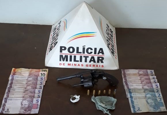 Foram apreendidos os seguintes materiais: 01 arma de fogo de fabricação caseira, calibre 38, 02 munições calibre 38, R$ 660,00 (recuperados), 08 maços de cigarro (recuperados), 01 papelote de cocaína, 01 capacete e mochila utilizada no roubo.