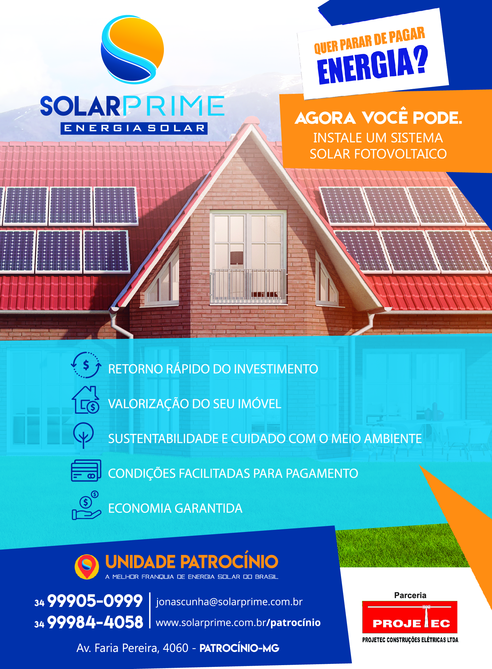 Você sabia que é possível gerar a sua própria energia? Com a SOLARPRIME você pode! Através de painéis fotovoltaicos altamente tecnológicos e com projetos customizados, a SOLARPRIME Energia Solar – Unidade Patrocínio, empresa parceira da Projetec Construções Elétricas, possibilita que seus clientes se tornem autossustentáveis. Durante o dia, o sistema capta a luz do sol e produz energia que é consumida instantaneamente e o excedente é injetado na rede da CEMIG. Durante a noite, os créditos acumulados são disponibilizados para o consumo. Esse sistema de compensação é mensurado através de um medidor bidirecional e ao final de cada mês, você pagará apenas uma taxa de disponibilidade na sua conta de energia. Tudo é feito de forma automática e regulamentado pela Agência Nacional de Energia Elétrica (ANEEL).