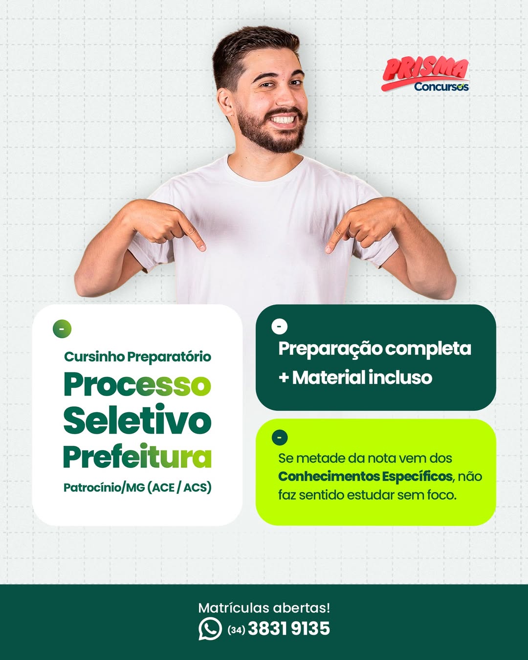 Por isso, o preparatório do Prisma Concursos é direto ao ponto, com foco total no edital e no conteúdo que realmente define a classificação. Aqui você tem método, direcionamento e treino no formato da prova.