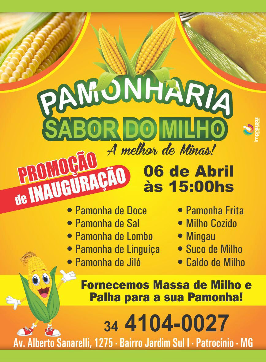 Acontecerá dia 06/04, sexta-feira, a inauguração da pamonharia Sabor do Milho, localizada na Avenida Alberto Sanarelli 1275, às 15 horas, Bairro Jardim Sul.