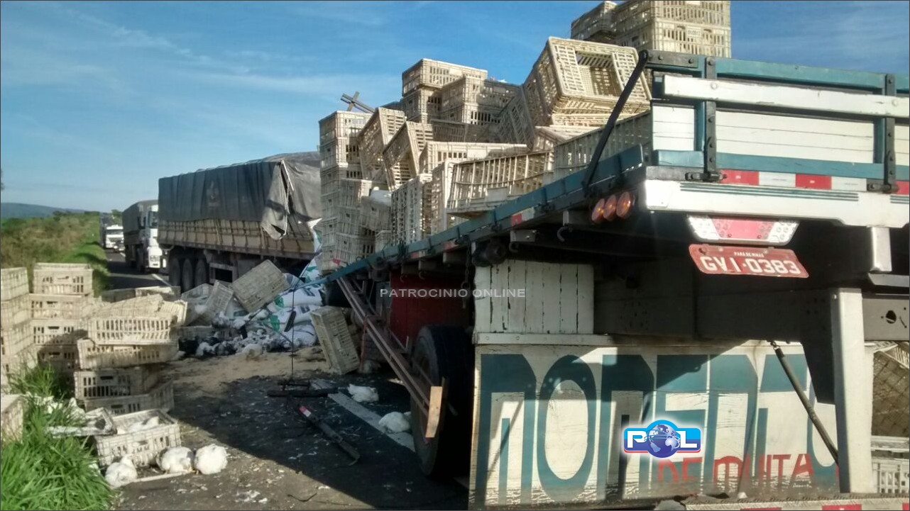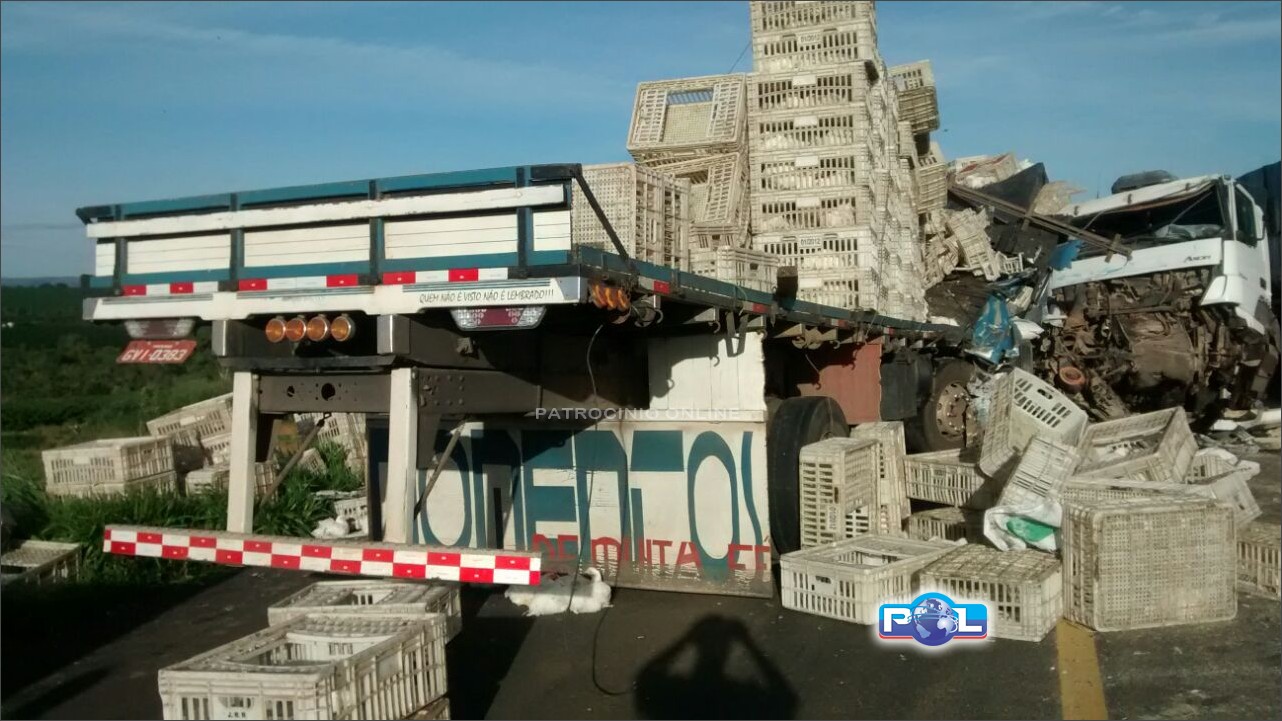 O acidente envolveu um caminhão Mercedez de placa GVI 0383 carregado com frango (aproximadamente 1.200 aves) e uma carreta com carga de farelo de soja (31.000 kilo).