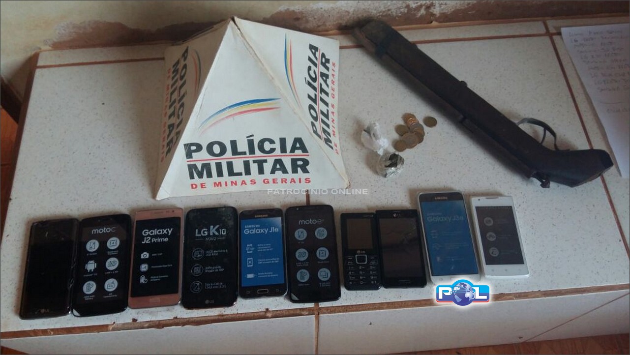 Em rastreamento as viaturas da Polícia Militar localizaram e prenderam um dos autores, sendo ele B.S.M. de 21 anos. Em seu poder foi encontrado uma espingarda polveira estilo escopeta (cano cerrado), 10 dez telefones celulares e 01 tablete de maconha.