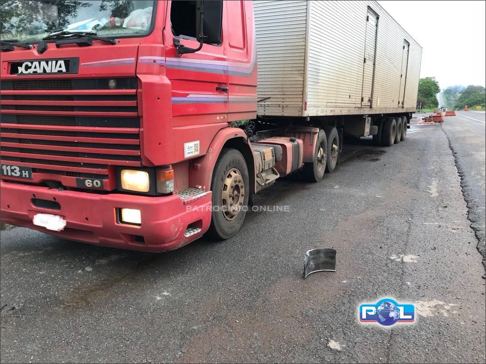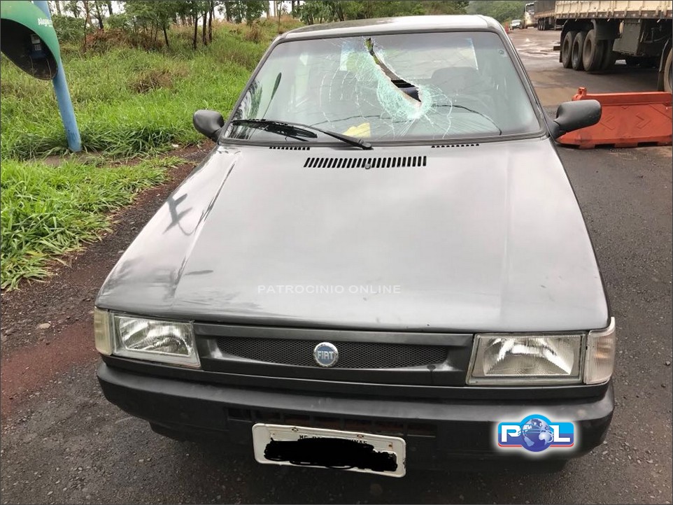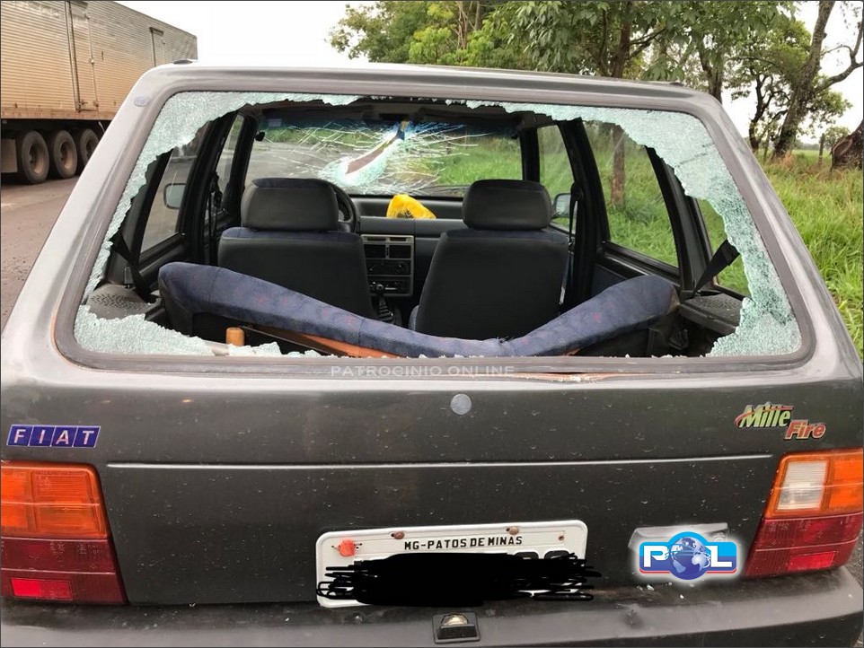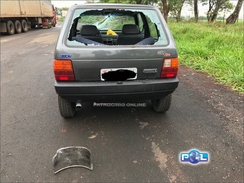 O senhor J.C.S.,condutor do veículo Fiat Un Mille Fire, transitava no sentido crescente na BR 365, quano na altura do KM 419, uma peça do tambor de freio de um caminhão vermelho que transitava em sentido oposto se desprendeu do mesmo e veio a atingir seu para-brisas, atravessando todo o interior do veículo, vindo a destruir o banco traseiro, quebrar o vidro traseiro e parar no asfalto.