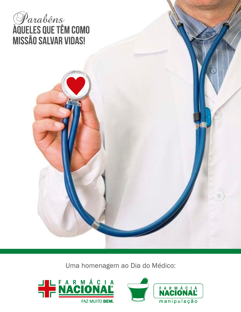 Hoje é dia do médico; um profissional especial, preparado, de grande conhecimento e capacidade que merece homenagens não só no seu dia, mas em todos os dias do ano. A medicina é um dom, por isso a Farmácia Nacional | Canaan parabeniza os nossos guardiões da saúde e agradece por atuarem com tanto zelo e dedicação nesta área tão importante para todos.
