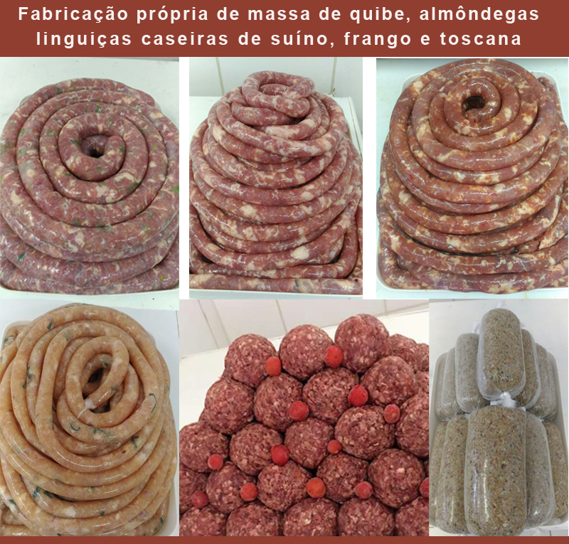 Lá você encontra também linguiças de suínos, frango e linguiça tipo toscana para churrasco de fabricação própria ou de marcas consagradas.