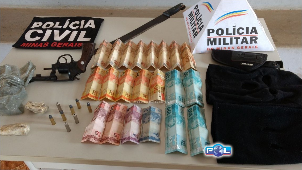 Na manhã desta segunda-feira (14/08), policiais civis de Patrocínio, militares de Guimarânia e uma equipe da ROCCA de Patos de Minas realizaram uma operação conjunta que resultou na apreensão de mais de novecentos reais em dinheiro, um revòlver calibre ponto 38, oito munições, uma toca ninja, um facão e duas buchas de maconha.