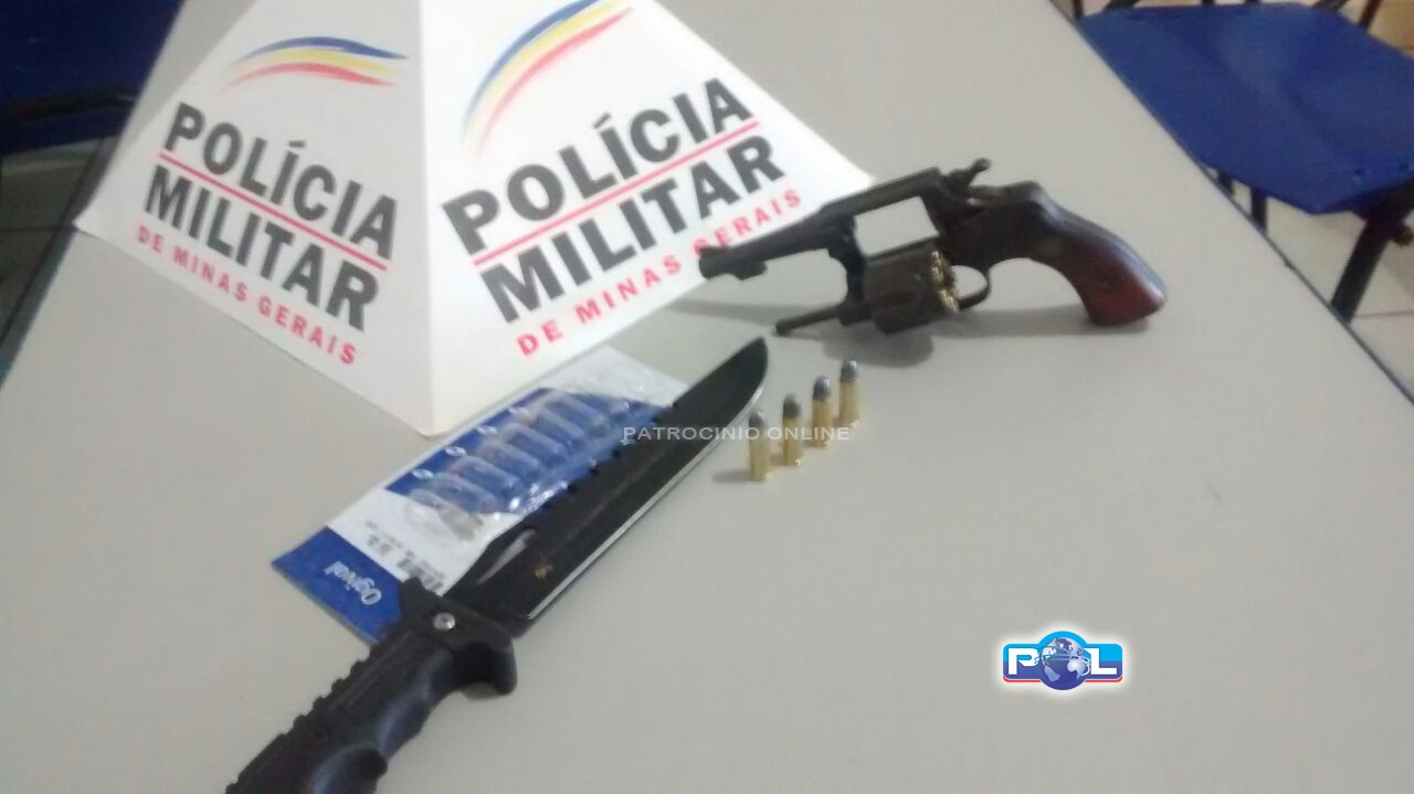 Após buscas, foi encontrado em uma sacola de café, um revólver calibre 38, municiado com 06 cartuchos intactos e uma faca com aproximadamente 20 cm de lamina.