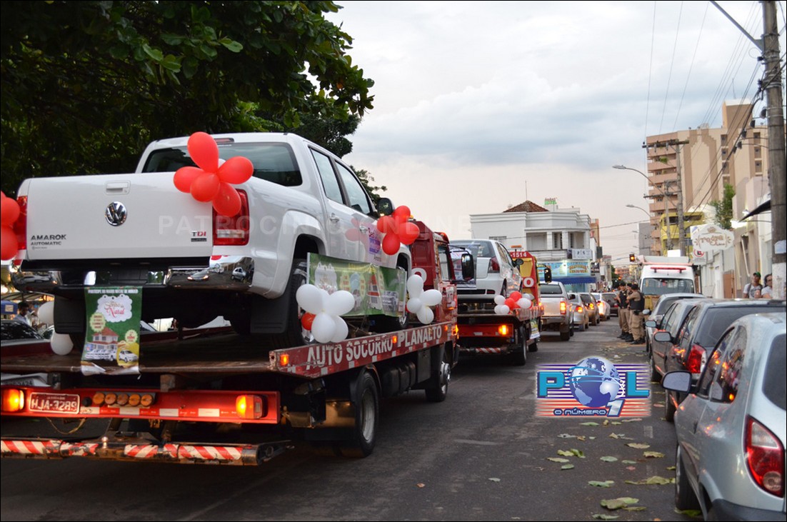 A carreata começou na Avenida Rui Brabosa, entrada de Patrocínio e desceu pelas principais ruas e avenidas da cidade até a Praça Honorato Borges, com as caminhonetes, pálio e outros prêmios da campanha de natal.