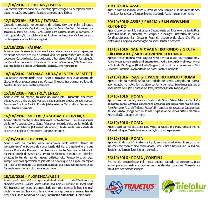 A Trajetus Turismo e Trielotur realizarão em outubro de 2016 viagem de peregrinação por Portugal e Itália. A viagem terá como diretor espiritual Frei Ederson, que atua na Paróquia Nossa Senhora do Patrocínio e também viaja pregando em retiros espirituais, principalmente de religiosos, por todo o Brasil.