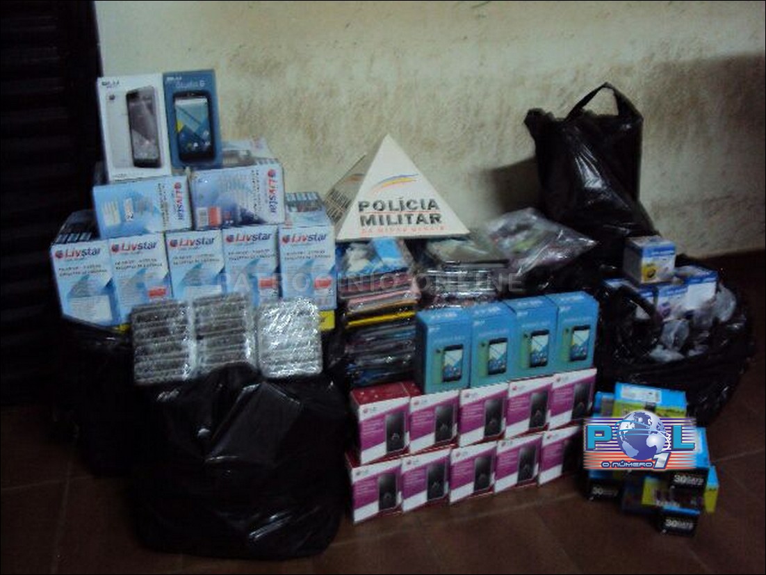 Questionados quando ao material transportado, estes relataram que seriam apenas capinhas e películas para telefones celulares. Durante conferência ao material transportado foram localizados diversos aparelhos celulares, cabos para celulares e notebook, rádios, entre outros itens.