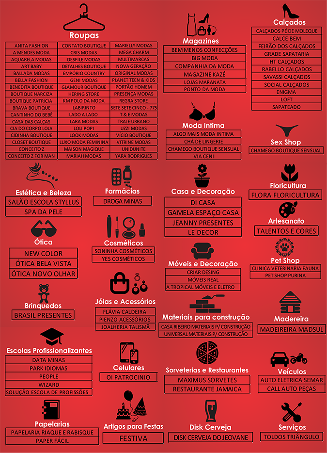Mais de 115 empresas de diversos ramos de atividade estão participando da promoção em Patrocínio e 9 empresas em Guimarânia. Conheça as empresas participantes: clique aqui ou veja abaixo: