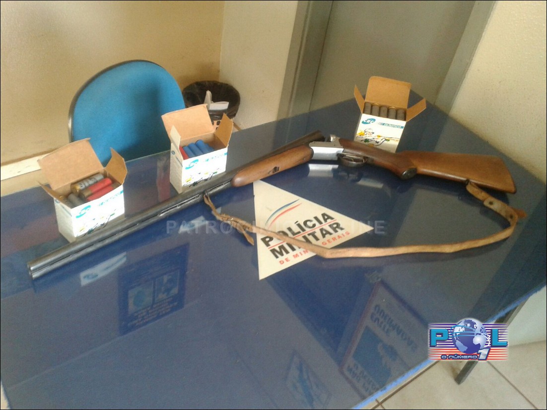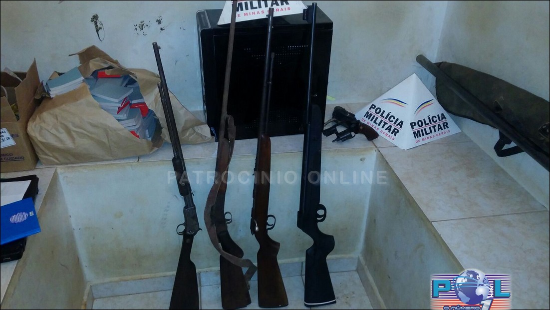 Em Coromandel (MG), durante operação policial envolvendo a 10ª Cia IND MAT e 98ª Cia PM/46º BPM, foram cumpridos vários Mandados de Busca e Apreensão, no endereço dos autores B. C. C., 53 anos e F. B. C., 43 anos, onde foram encontradas duas armas de fogo, sendo uma carabina rifle 36 e uma espingarda polveira cal.22, 16 munições cal. 22, uma munição cal 12,