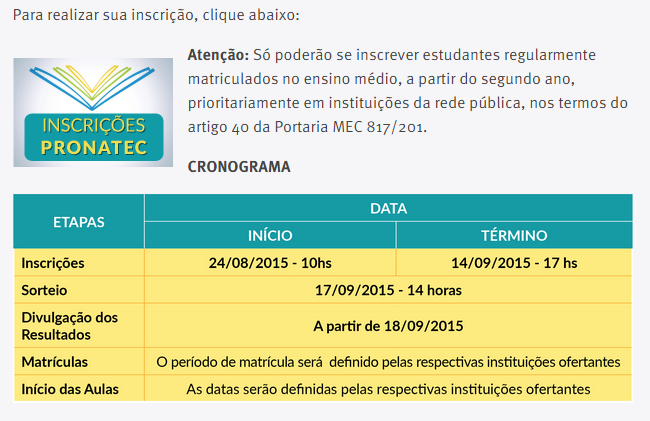 As inscrições são feitas através do site (www.educacao.mg.gov.br) ou no SENAI. As inscrições serão realizadas apenas pela internet até o dia 14 de setembro de 2015 as 17horas.