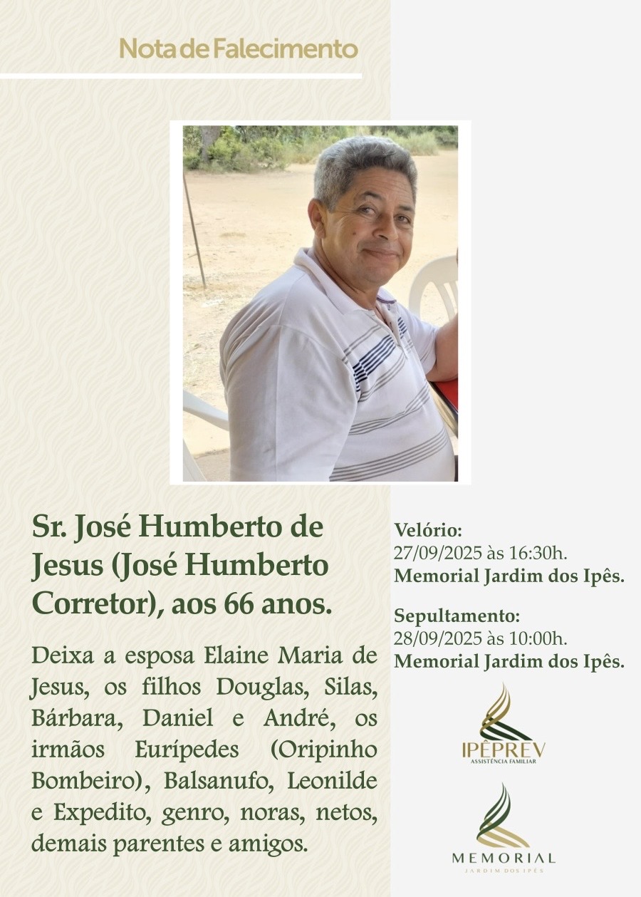 A cerimônia de despedida será realizada hoje, domingo, 28/09/2025, na Sala 01 da Funerária Frederico Ozanam, a partir das 14h.