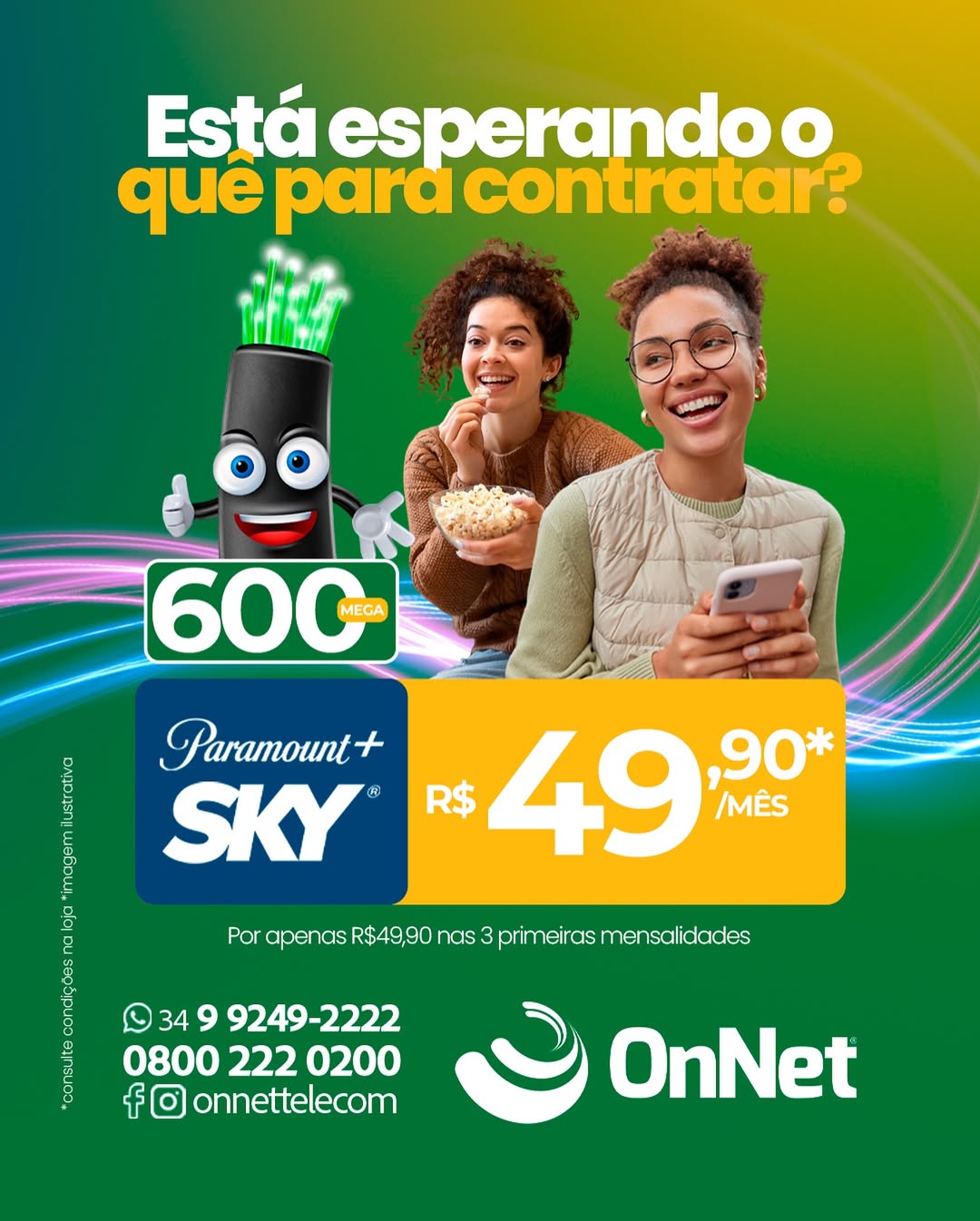 Com a OnNet, você tem 600 Mega de velocidade + Paramount+ + Sky por apenas R$49,90/mês nas 3 primeiras mensalidades!