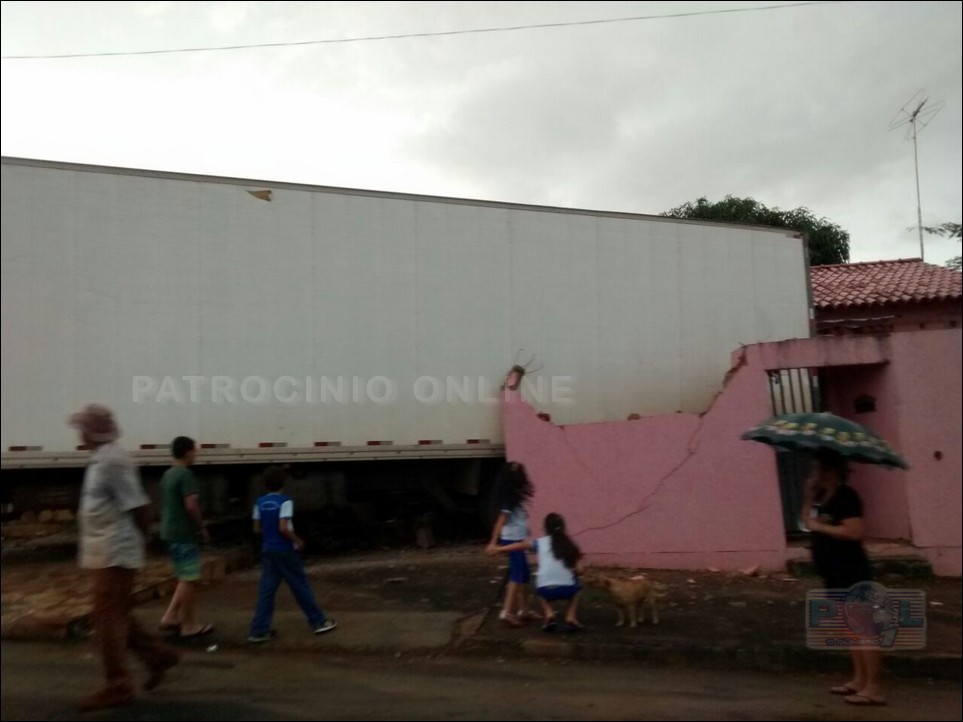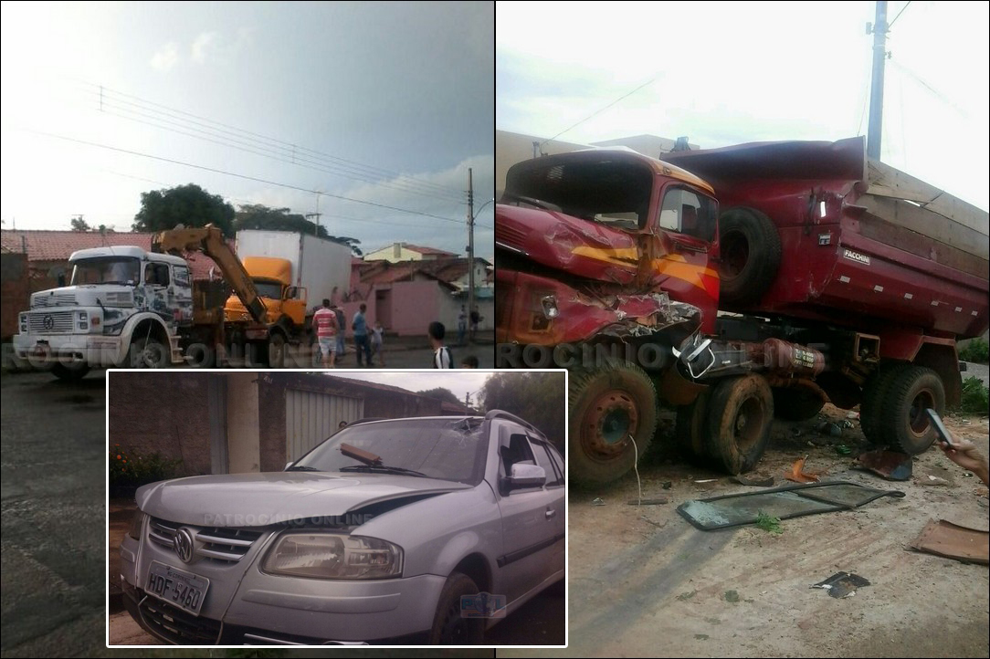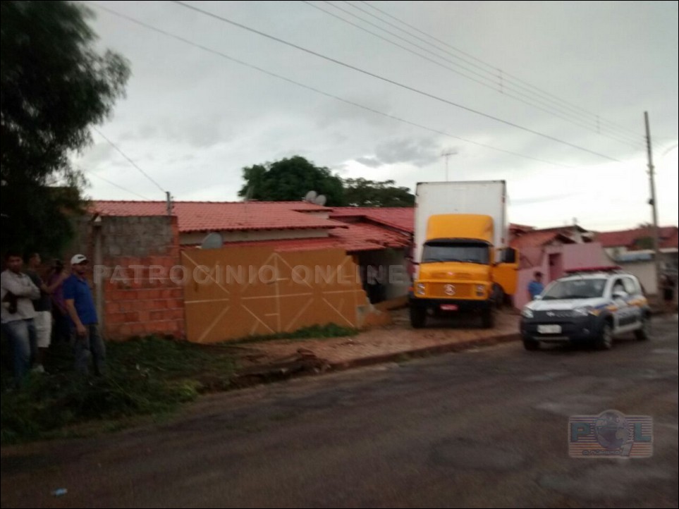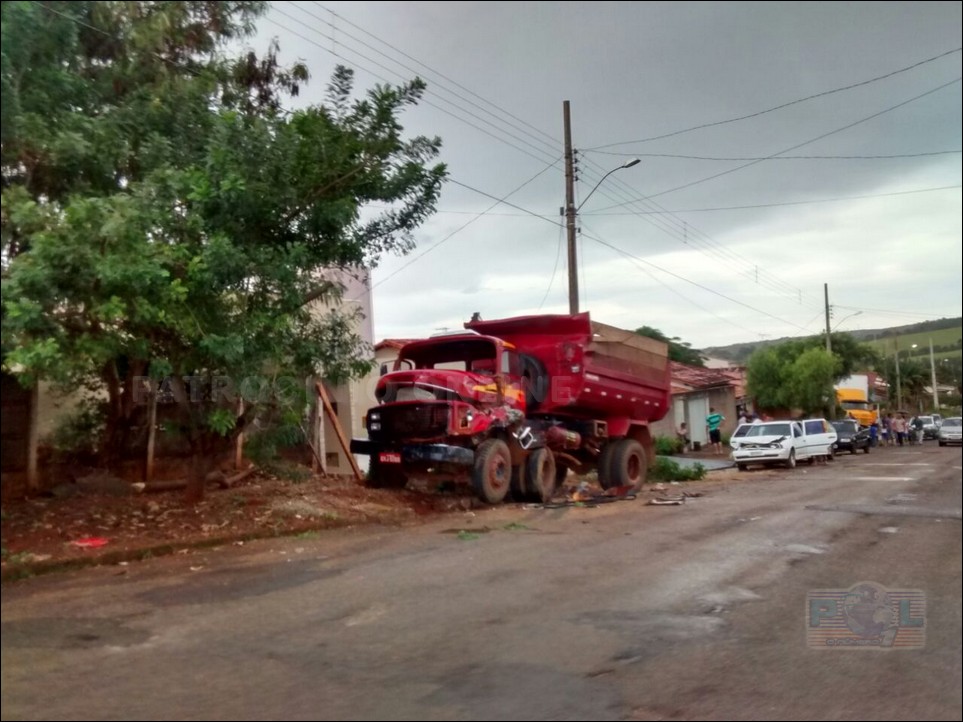 Na Rua Vicente Ferreira Borges, bairro União em Coromandel (MG), as 15h30m de segunda-feira, dia 4 e maio, o condutor desse caminhão Mercedez benz de cor amarela realizava uma manobra de ré quando perdeu o controle e desgovernado bateu em seguida neste caminhão vermelho, num VW Gol, numa VW Parati, quebrou a parede e entrou numa casa e ainda bateu no veículo que estava na garagem.