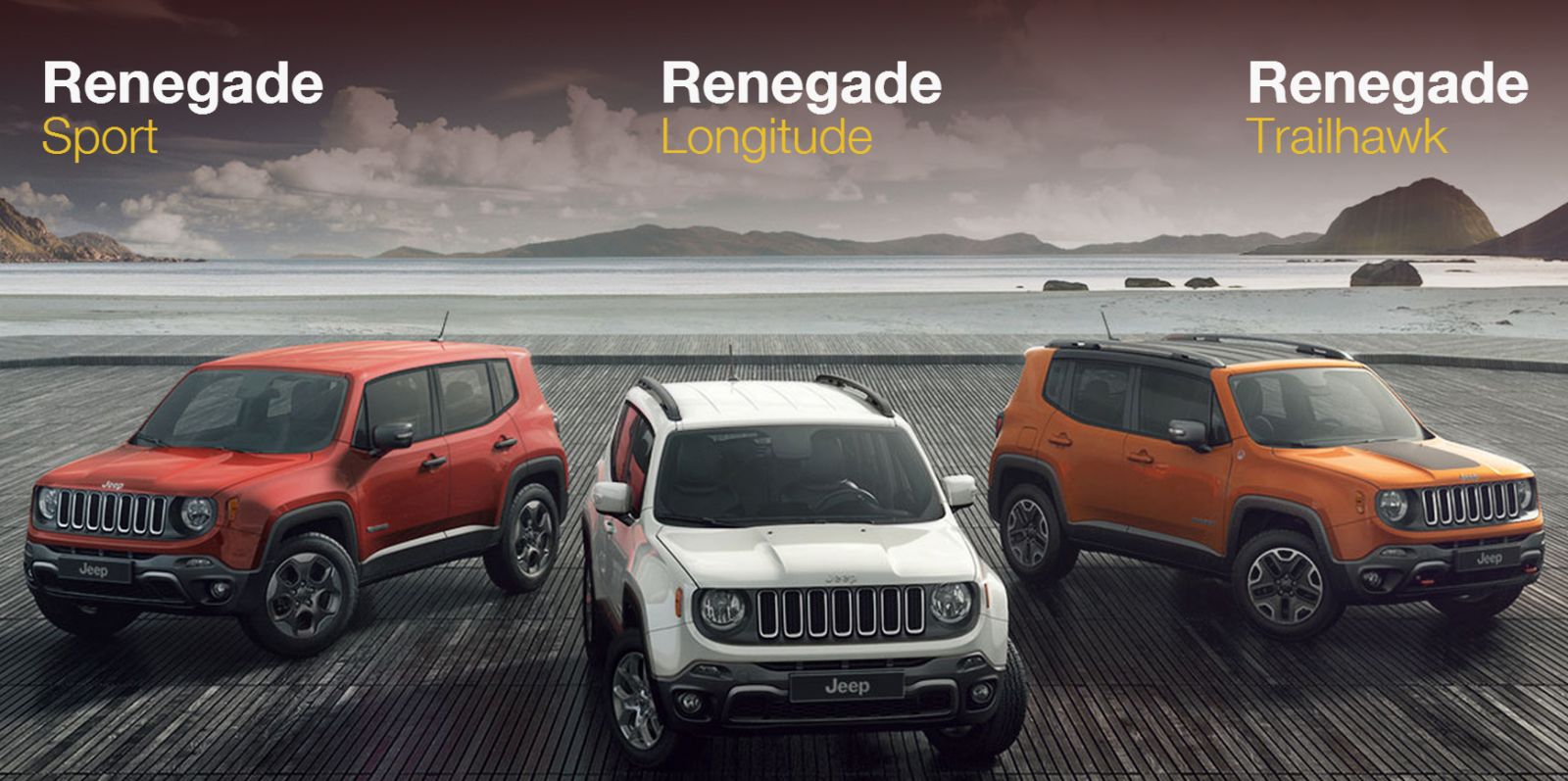 O Jeep Renegade será vendido em três configurações de acabamento: Sport, Longitude e Trailhawk. Conforme antecipado por Autoesporte, a versão de entrada Sport virá equipada com motor 1.8 flex de 130/132 cavalos de potência e 18,6/ 19,1 kgfm de torque e opções de câmbio manual de cinco marchas ou automático de seis. Quem quiser também poderá optar pelo o 2.0 turbodiesel de 170 cv de potência e 35,6 kgfm de torque, acoplado à caixa automática de nove marchas e sempre com tração 4x4.