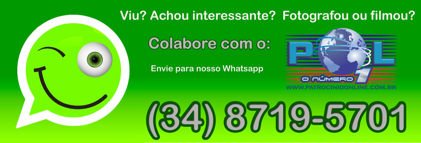 O Repórter Popular é o novo espaço do leitor do Patrocínio Online para reclamar, reivindicar, manifestar, mostrar algo interessante ou bonito, ou mesmo se presenciou algum fato interessante. O leitor, se quiser, pode narrrar o fato e se identificar ou ter a sua identidade mantidade em sigilo. Mesmo que não identifiquemos o leitor, exigimos que se identifique para nossa editoria.