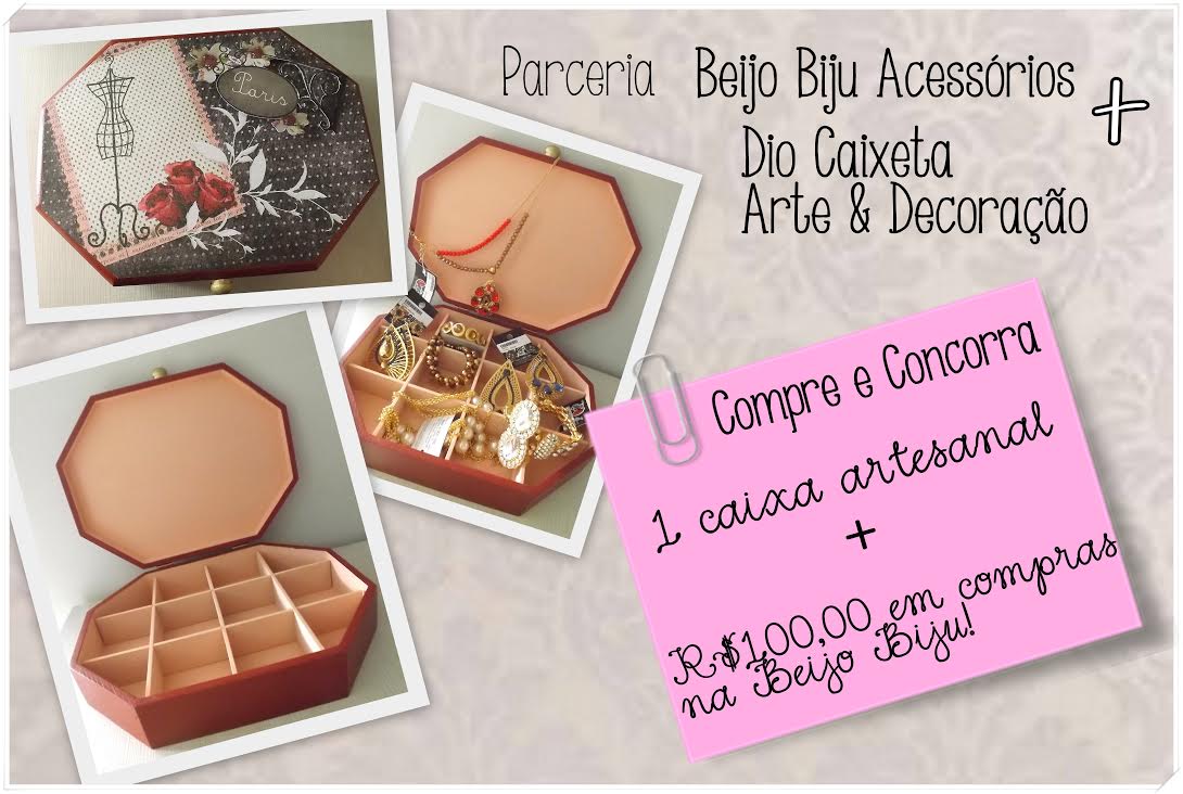 A Beijo Biju, juntamente com Dio Caixeta Artesanato & Decoração está sorteando uma linda caixa artesanal, além de R$100,00 em compras na Beijo Biju Acessórios! Não fique fora dessa! O sorteio será realizado dia 31 de março.