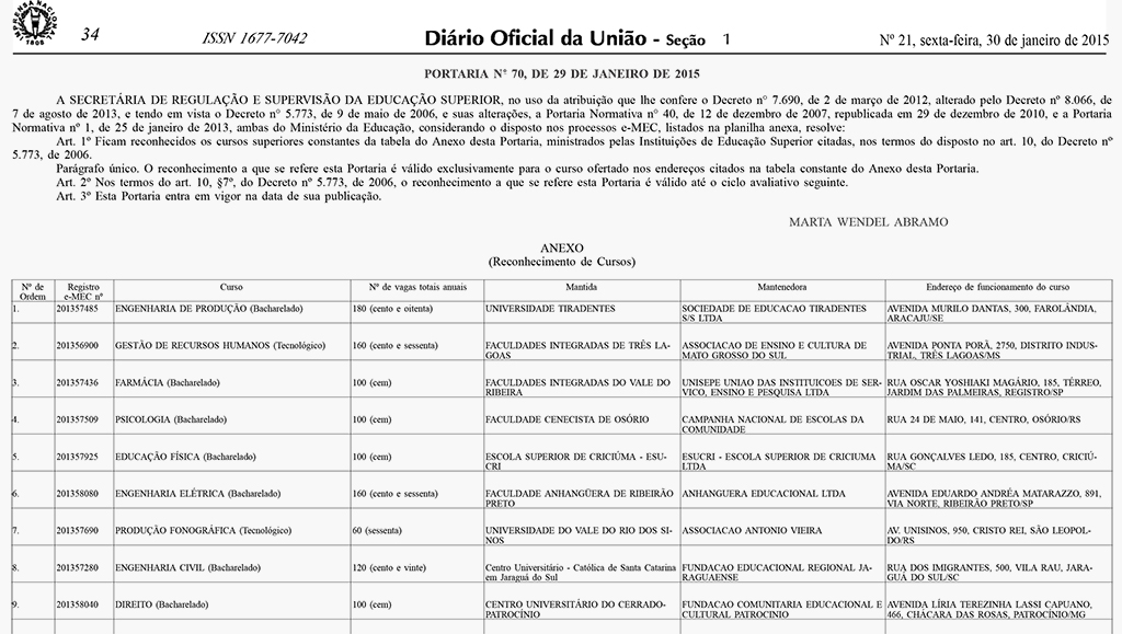 O Ministério da Educação (MEC) publicou no Diário Oficial da União desta sexta-feira, 30, a Portaria nº70/2015 em que reconhece o curso de Direito do UNICERP. A conquista foi comemorada pelo Centro Universitário do Cerrado Patrocínio. A instituição já havia sido comunicada sobre o reconhecimento com nota 04, numa escala de 01 a 05, mas aguardava a publicação oficial por parte do Ministério.