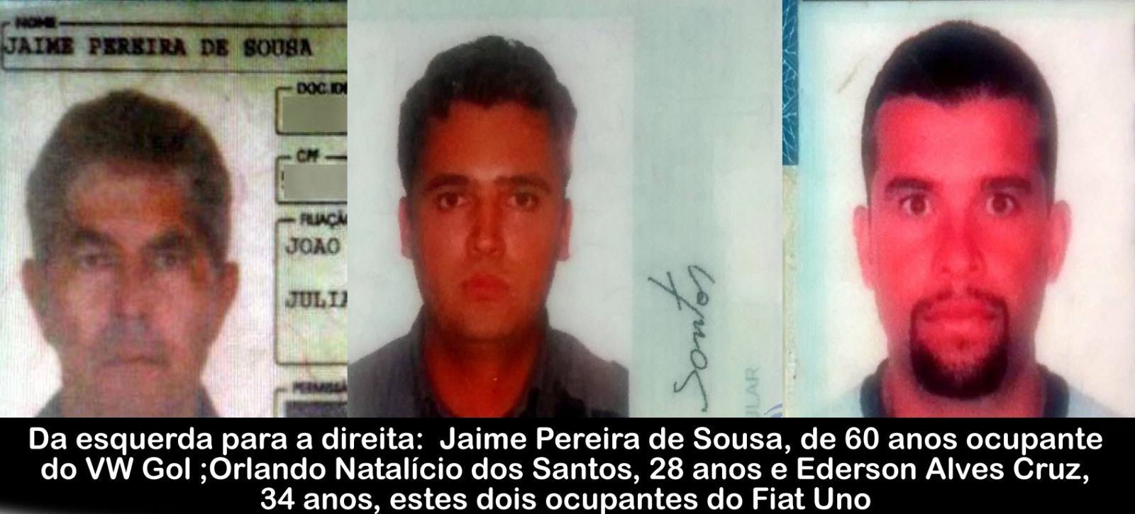 Os ocupantes do FIAT/Uno que morreram no local do acidente são Ederson Alves Cruz, 34 anos, Orlando Natalício dos Santos, 28 anos e Luana da Silva Braz, 25 anos, grávida de seis meses.