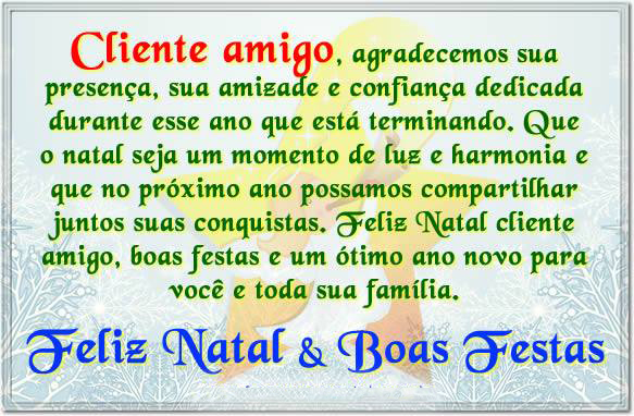 "Um ano é feito não apenas de dias, semanas e meses, mas da colaboração de todos aqueles que estão empenhados no sucesso de uma idéia, de um objetivo, de um negócio. O ano é feito de Clientes, Colaboradores, que se dedicam a tornar nosso dia a dia mais simples e assim podermos aproveitar de momentos felizes em família como o Natal e Ano Novo! Nossos mais sinceros votos de Boas Festas, Feliz Natal e um Próspero Ano Novo."