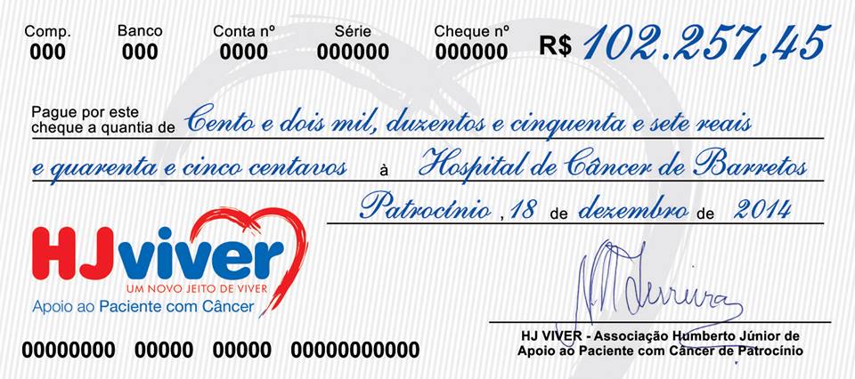 Representantes da HJVIVER estiveram em Barretos-SP e entregaram oficialmente a renda do show César Menotti e Fabiano, no valor liquido R$ 102.257,45 para o Hospital de Câncer de Barretos-SP.