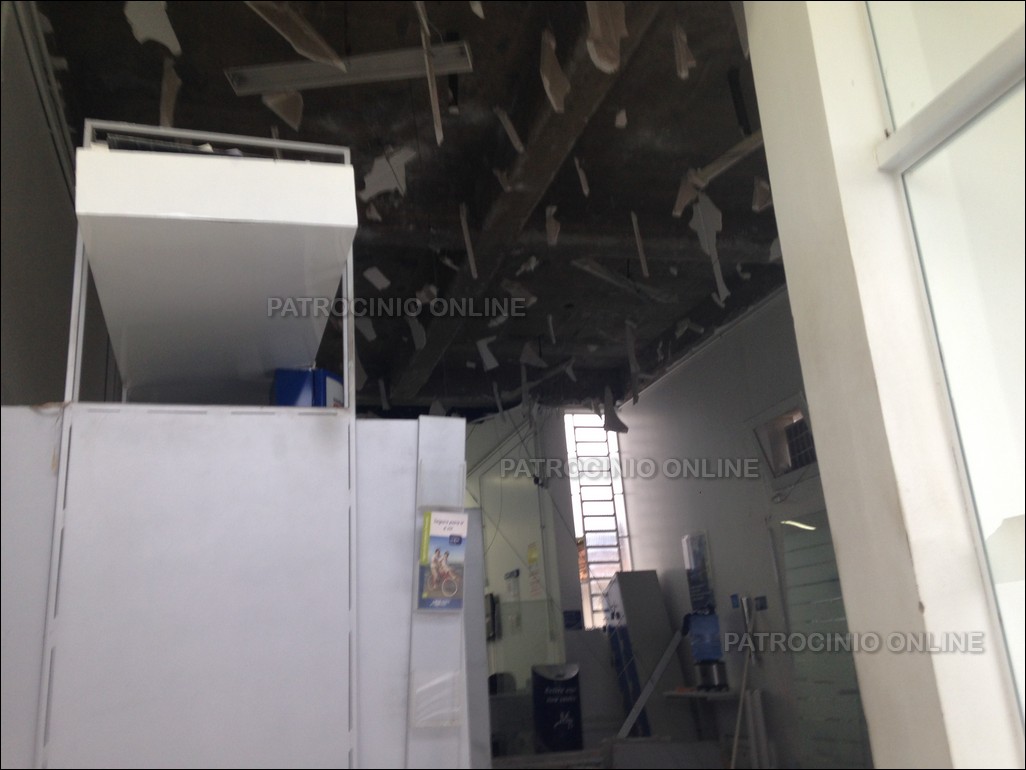 O interior do banco ficou destruído, com o teto de gesso vindo abaixo e grande parte dos vidros quebrados.
