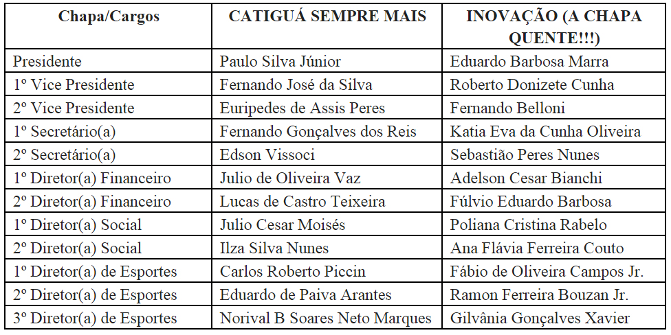 A “chapa” Catiguá Sempre Mais tem como candidato a Presidente, o empresário Paulo Silva Junior “Paulinho da Center Paulo”, atual diretor de esportes do clube.