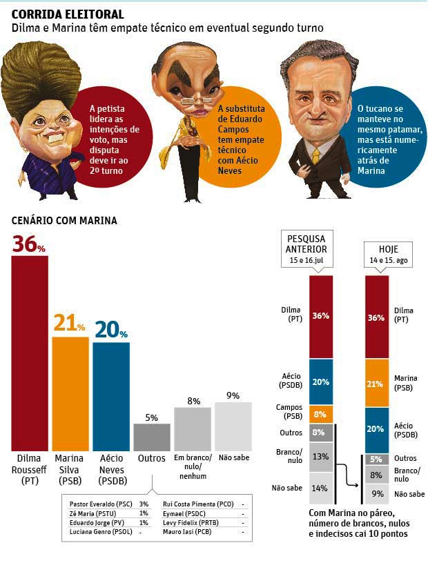 Pesquisa feita pelo Datafolha para o jornal "Folha de S.Paulo" divulgada na edição desta segunda-feira (18) mostra Dilma Rousseff (PT) com 36% das intenções de voto para presidente, seguida de Marina Silva (PSB), com 21%, e Aécio Neves (PSDB), com 20%.
