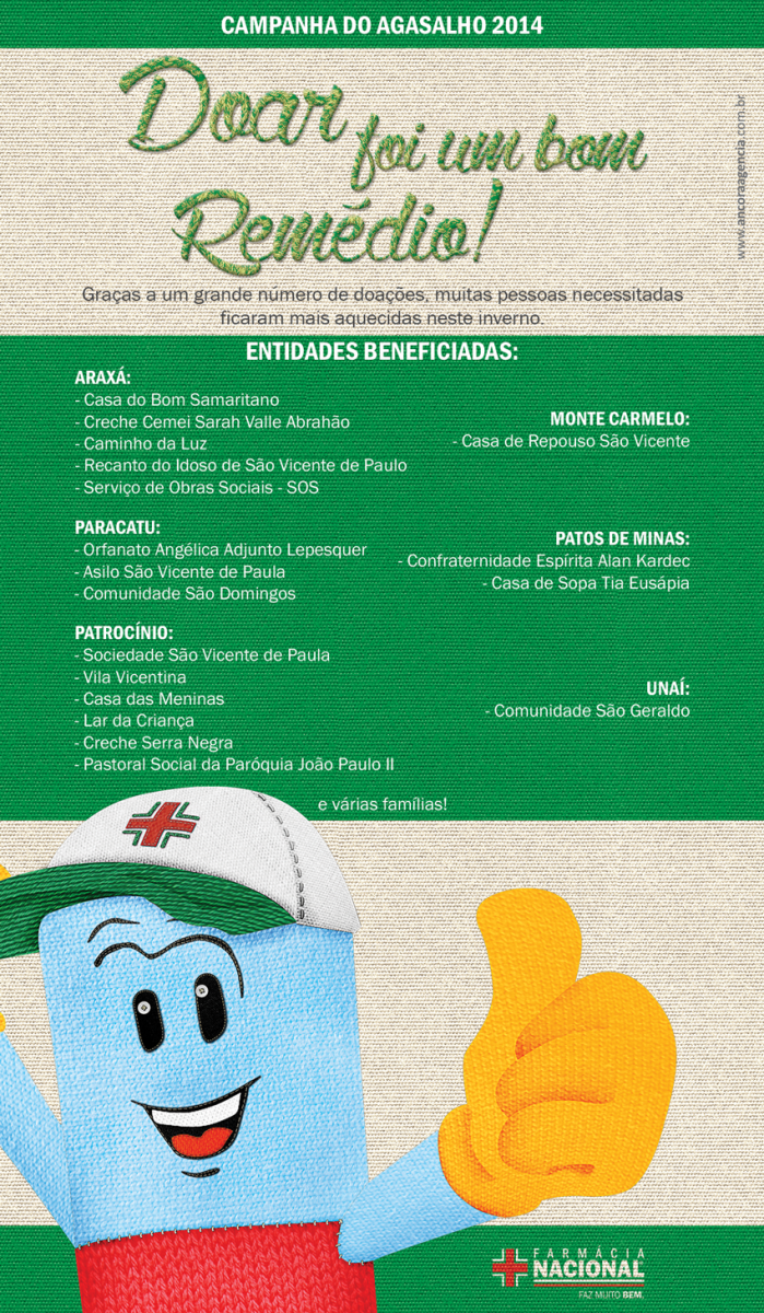 A Farmácia Nacional agradece a todos os clientes, colaboradores, fornecedores e amigos que contribuíram para o sucesso em mais esta ação. O desejo é de que em 2015 o resultado possa se repetir mais uma vez.