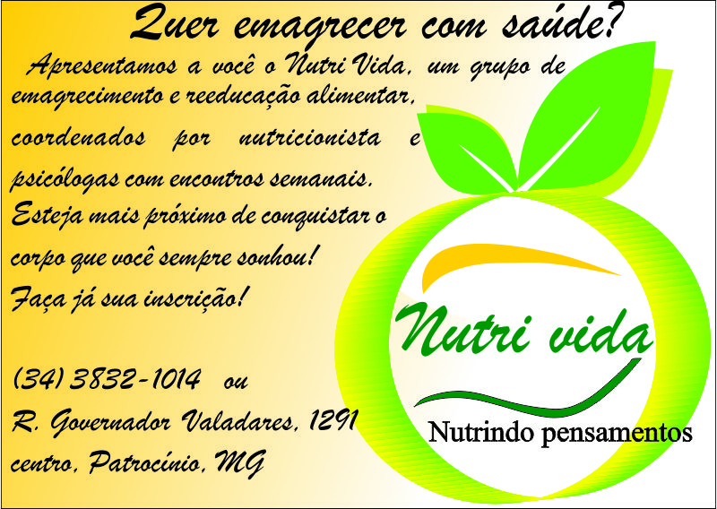 O caminho ideal para o emagrecimento é no Grupo Nutri Vida. Um grupo diferenciado, dinâmico, com nutricionista e psicólogos. Você pode emagrecer de forma saudável! Entre nesse Grupo!!!!!!