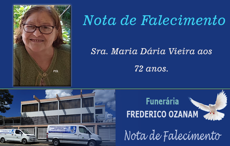 Faleceu nesta terça-feira, dia 09 de setembro de 2025,em Patrocínio/MG, Sra. Maria Dária Vieira aos 72 anos.