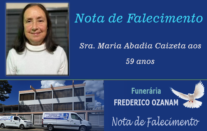 Faleceu em 1º de setembro de 2025, em Patrocínio/MG, a Sra. Maria Abadia Caixeta aos 59 anos.