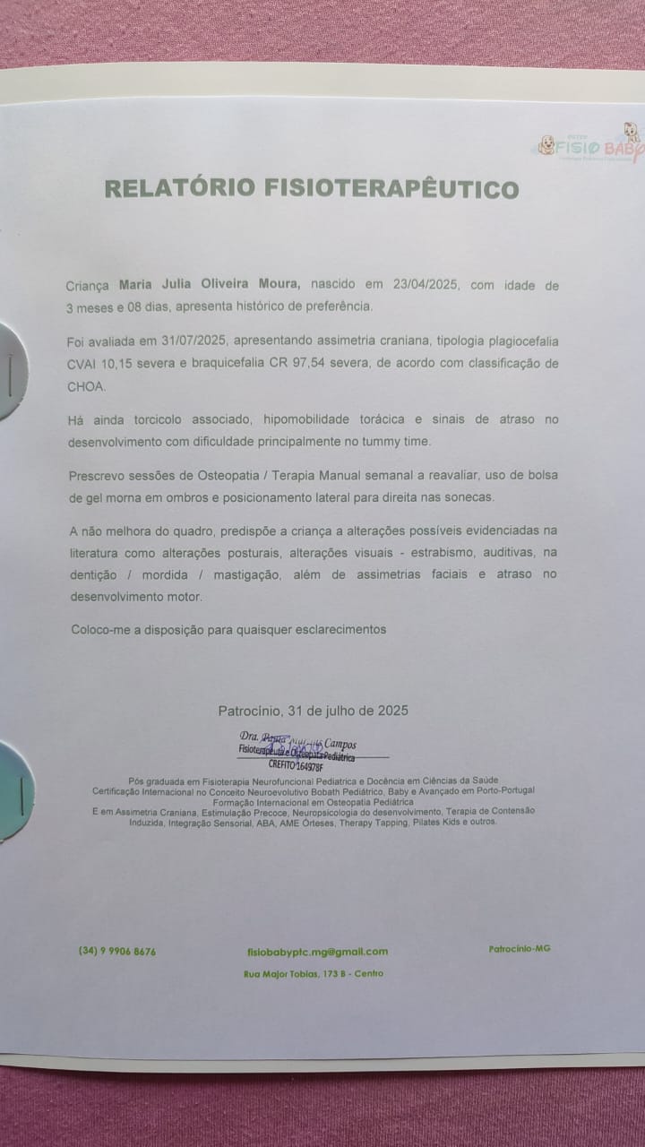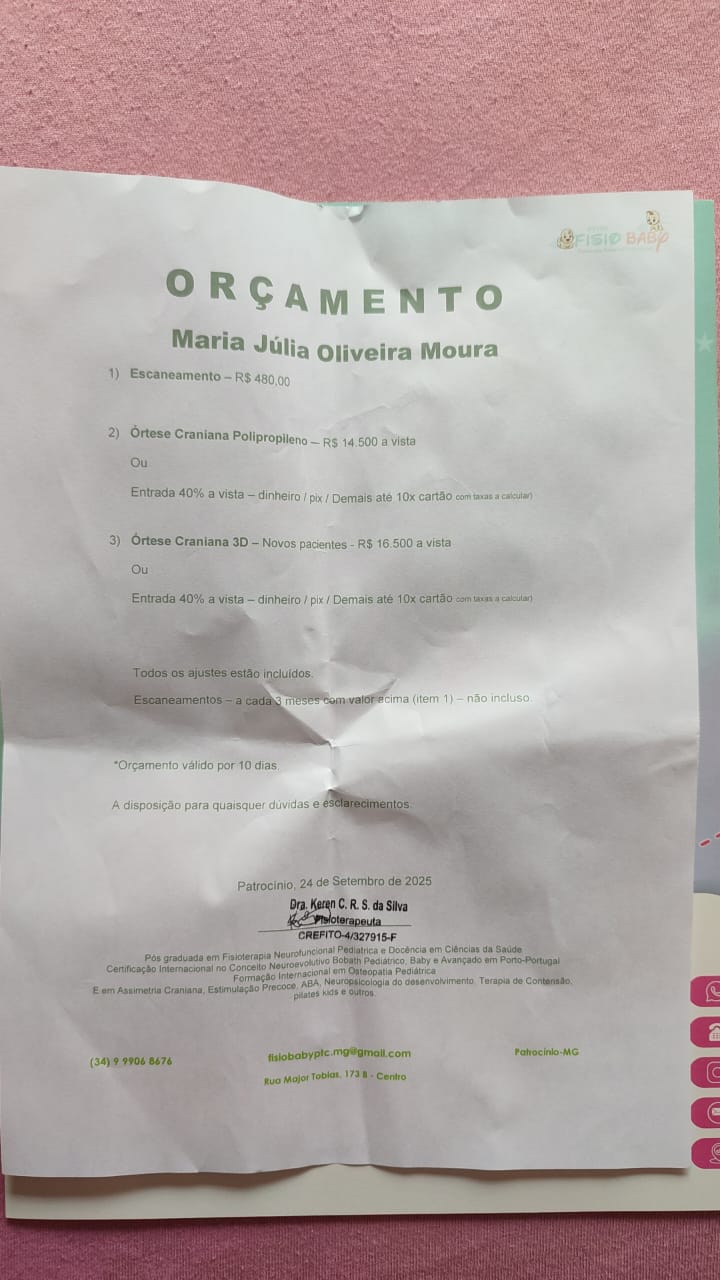 Segundo a mãe, a criança tem assimetria craniana, plagiocefalia e braquicefalia severa e precisa muito usar uma órtese craniana para minha cabecinha voltar ao normal.
